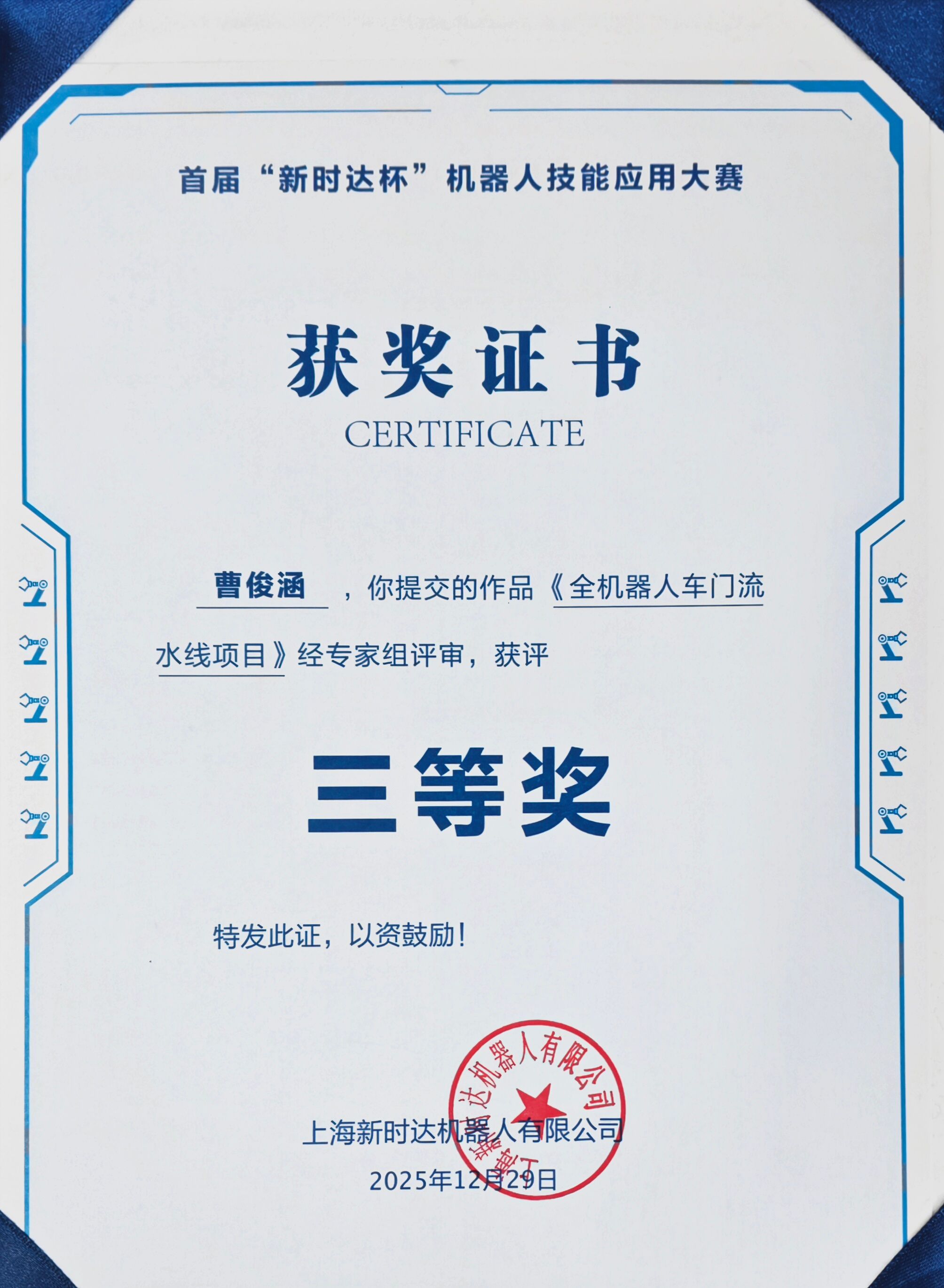 2025年12月29日,由上海新时达电气股份有限公司主办的首届“新时达杯”机器人技能应用大赛评选结果揭晓。我院学子表现优异,2024级工业机器人技术专业学生曹俊涵凭借《全机器人车门流水线项目》荣获全国三等奖,彰显扎实的专业技能与工程应用能力。