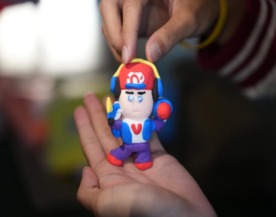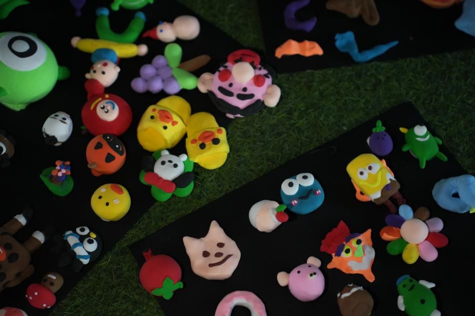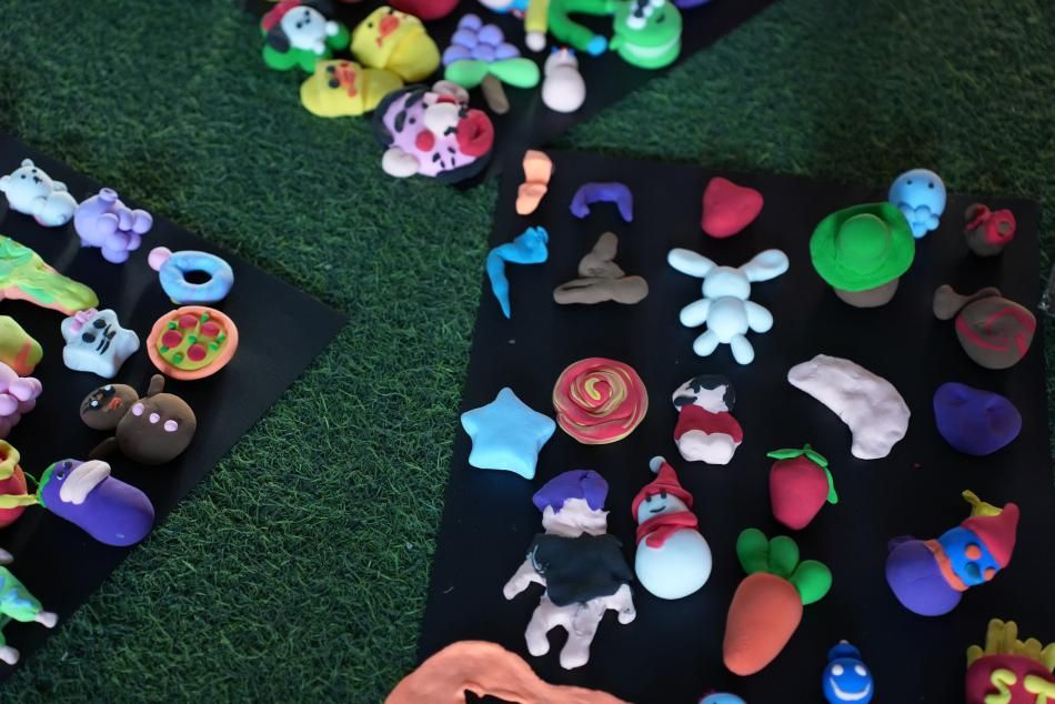 在粘土的摊位前,彩色粘土被分成一小团一小团,像极了校园里细碎又珍贵的快乐。有的同学捧着粘土,轻轻揉捏感受质感,慢慢塑形——或许是一只举着爱心的小熊,藏着对朋友的感谢;或许是一朵绽放的小花,代表着对生活的热爱;还有的同学捏出简单的笑脸,用最直白的造型传递好心情。当这些形态各异的粘土作品被一一黏在画板上,原本纯色的板子渐渐变成了“情绪博物馆”,每一件作品都在诉说着创作者的心事,也让路过的人感受到满满的治愈。