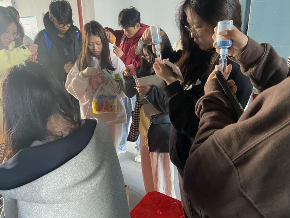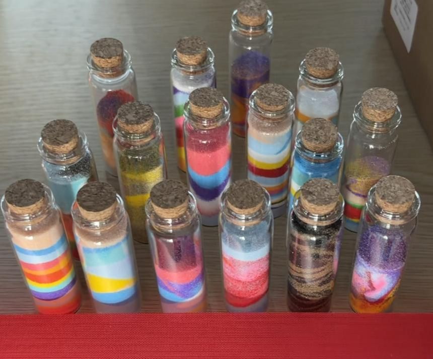 彩砂区域则像是一个“色彩疗愈空间”。透亮的玻璃瓶整齐排列,旁边的彩砂盒里,从温柔的浅粉到沉静的墨蓝,从明亮的鹅黄到清新的草绿,每一种颜色都对应着不同的心情。同学们将彩砂缓缓倒入瓶中,为了让砂层更均匀,还会轻轻敲击瓶身,看着色彩在瓶内慢慢沉淀、分层,仿佛心底的杂乱情绪也随之变得有序。有同学搭配出渐变的“日落色系”,来纪念某天傍晚看到的校园晚霞,还会和身边人分享自己的创作思路,简单的对话里,满是心意的传递。