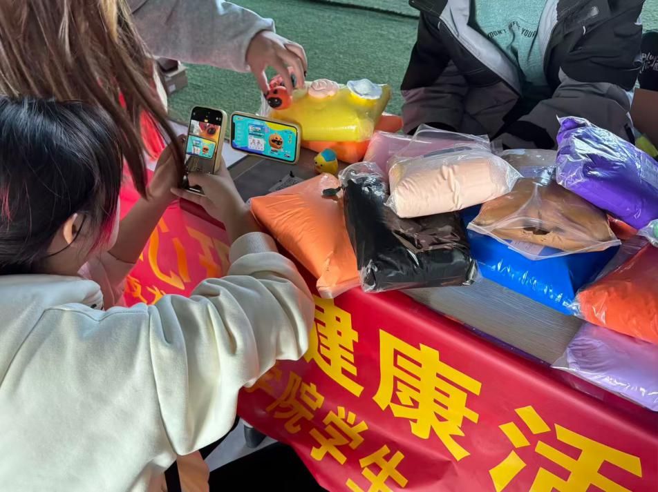活动现场的展示区,成了最能触动人心的“温暖角落”。粘土画板上,各式作品挤挤挨挨,可爱又鲜活:憨态可掬的卡通形象歪着脑袋,灵动的植物造型带着软萌的弧度,连不起眼的小云朵都捏出了蓬松的质感,不同色彩的粘土碰撞出满满的活力,吸引到许多路过同学的目光。;旁边的沙瓶,更是像藏着一片“小彩虹”,有的沙瓶用浅紫叠着淡蓝,像清晨的薄雾;橙红衬着明黄,似午后的暖阳;还有的在瓶底藏了一小撮银色细闪,像夜晚的星光。路过的同学忍不住驻足观赏,拿起手机记录喜欢的作品,让治愈的氛围在展示区不断蔓延。