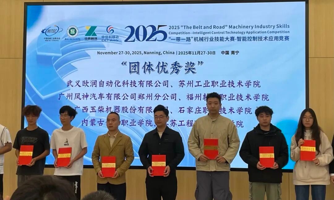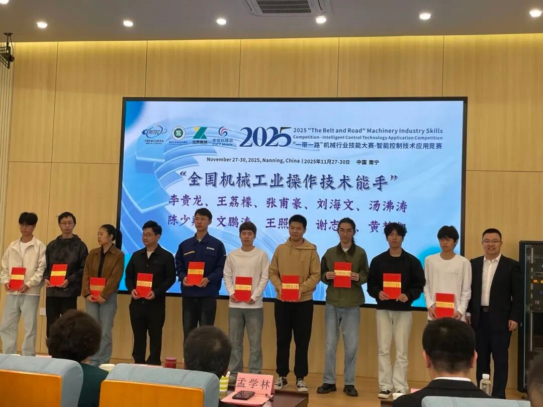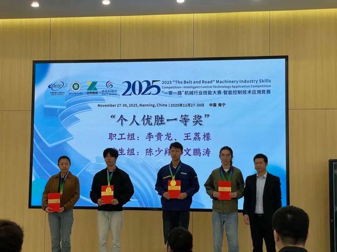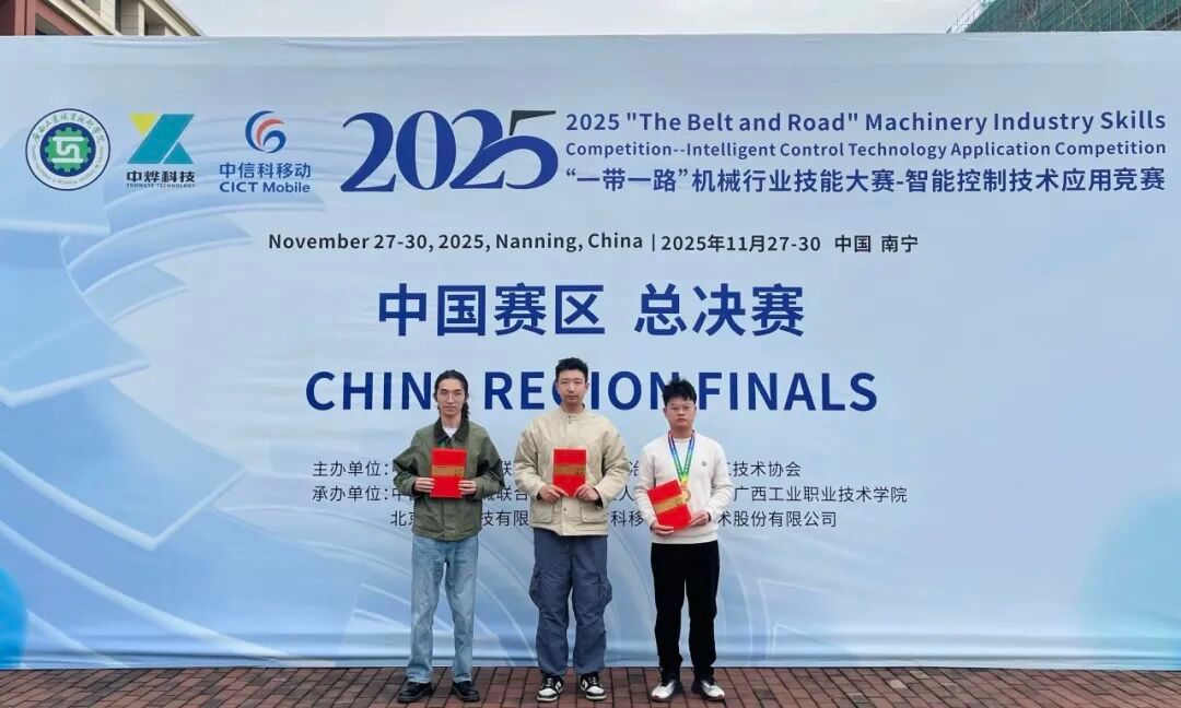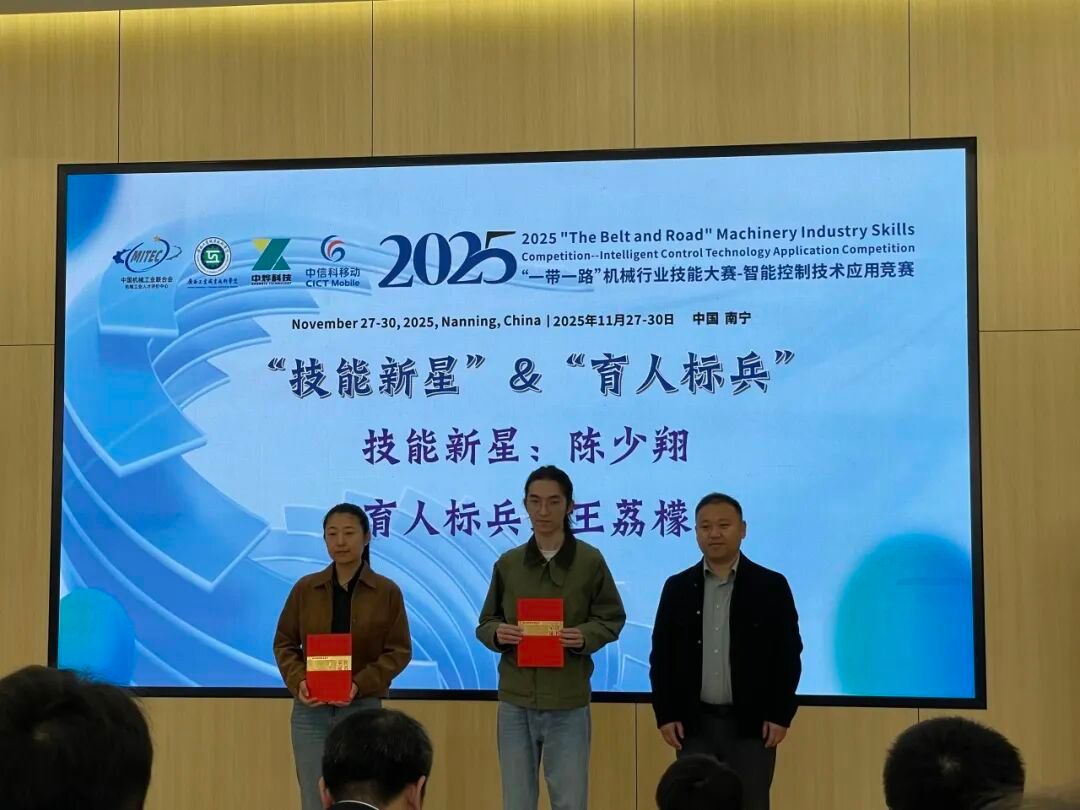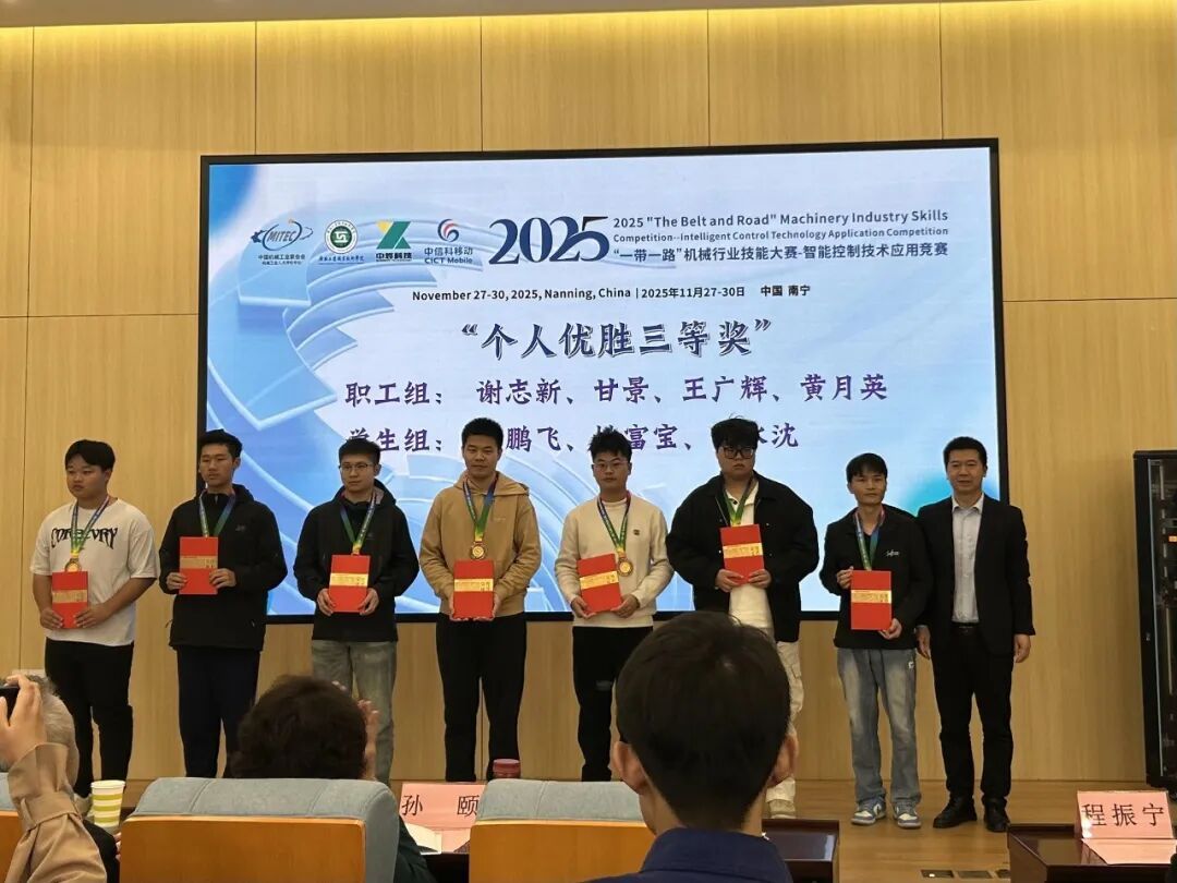 近日,2025年“一带一路”机械行业技能大赛——智能控制技术应用竞赛决赛在广西南宁圆满落幕。本次大赛于11月27日-30日隆重举办,吸引了全国各地的优秀选手齐聚一堂,同台竞技切磋。我校未来技术产业学院陈少翔、黄水沈二位学子在指导教师刘积帆的悉心指导下,凭借扎实的专业功底和出色的实操能力斩获多项荣誉,学校亦荣获团体优秀奖。