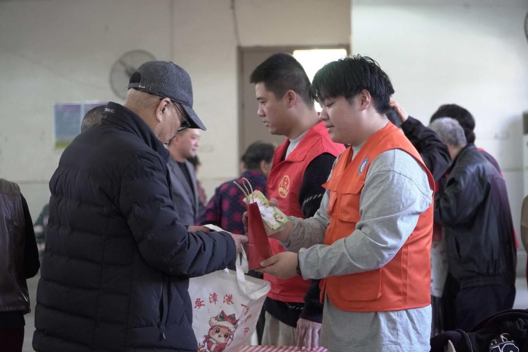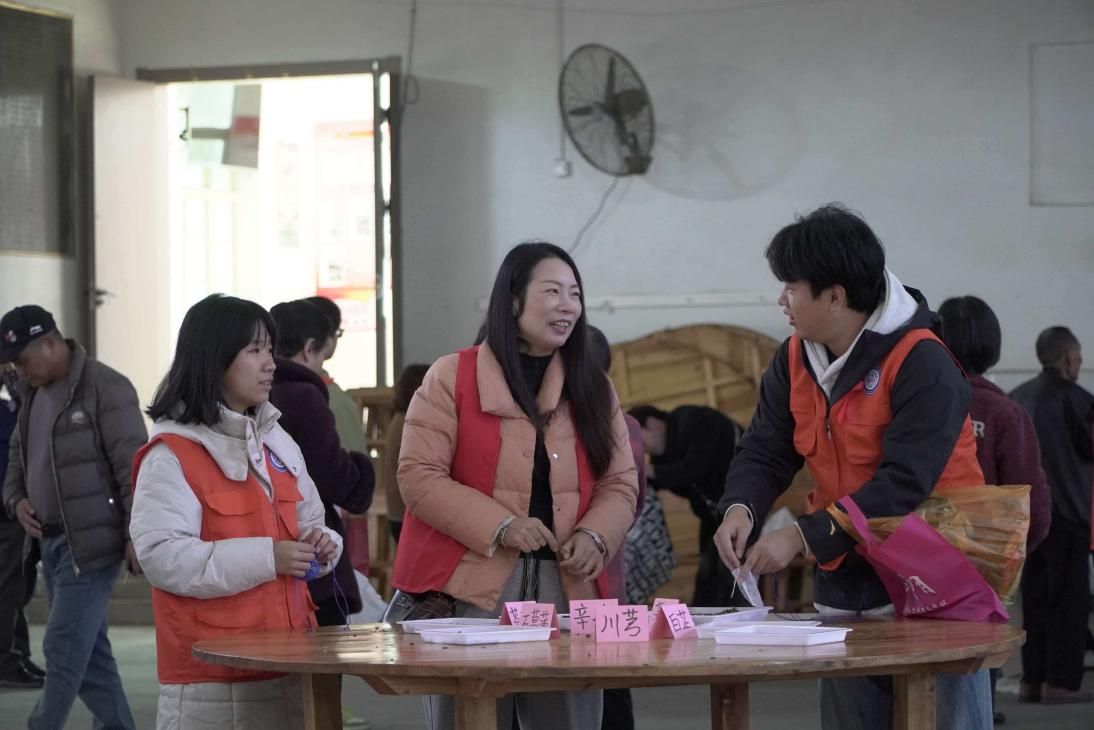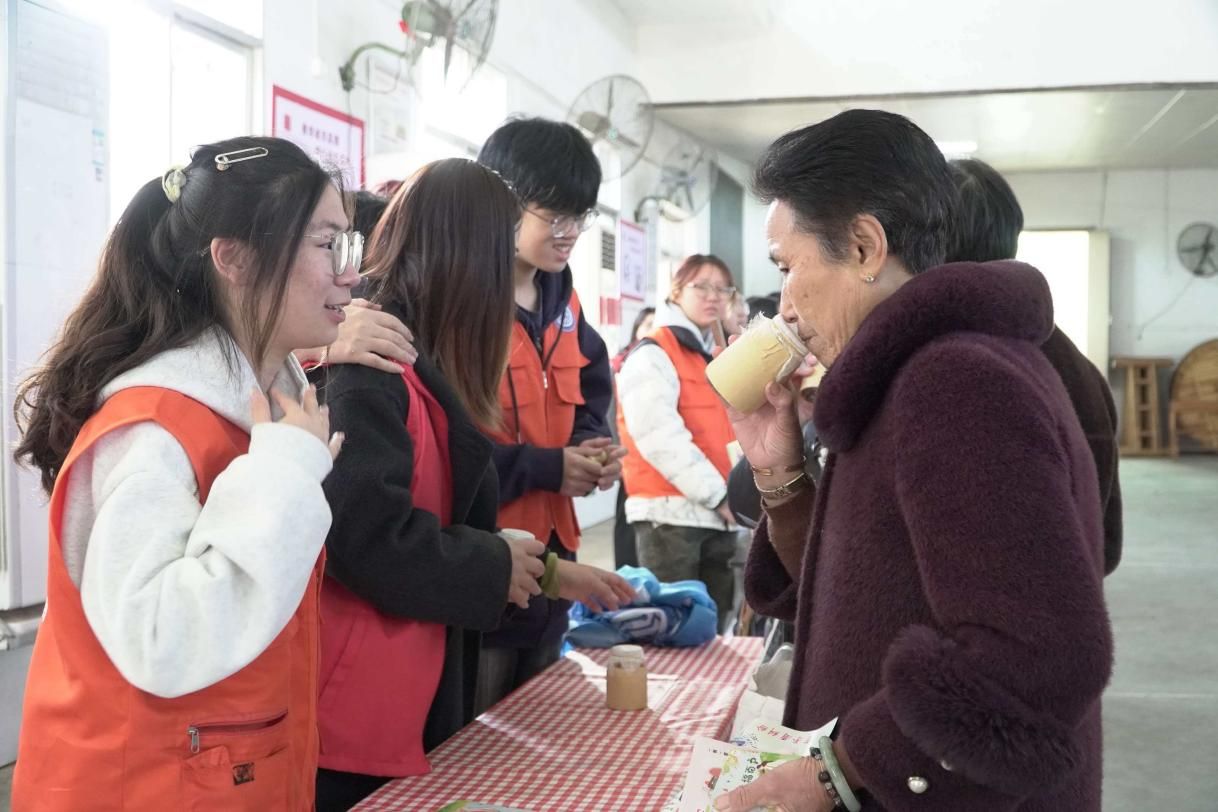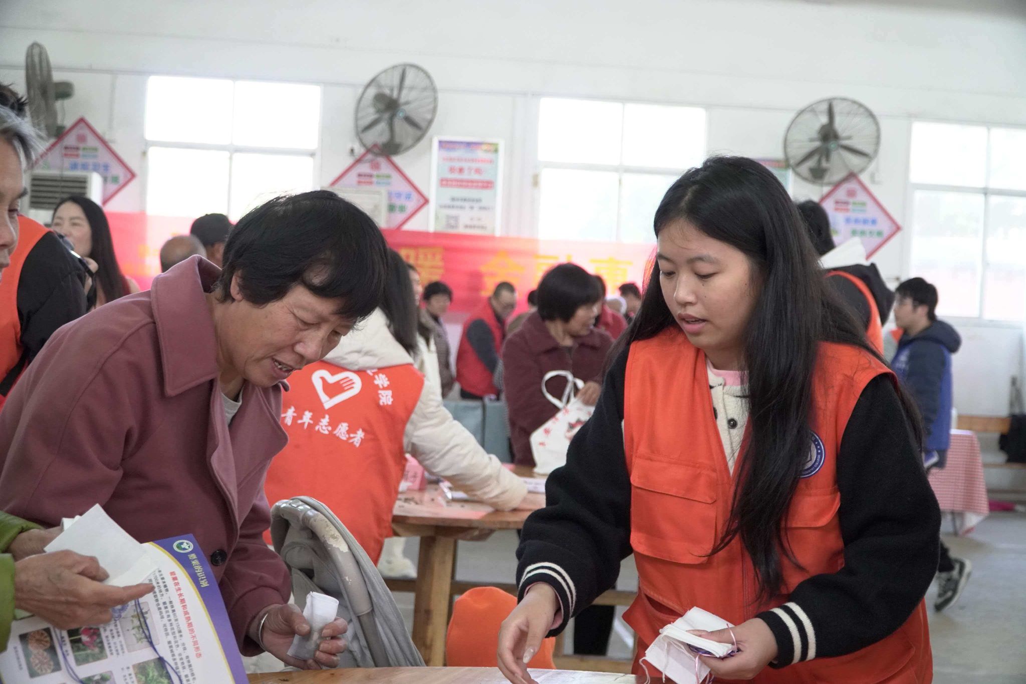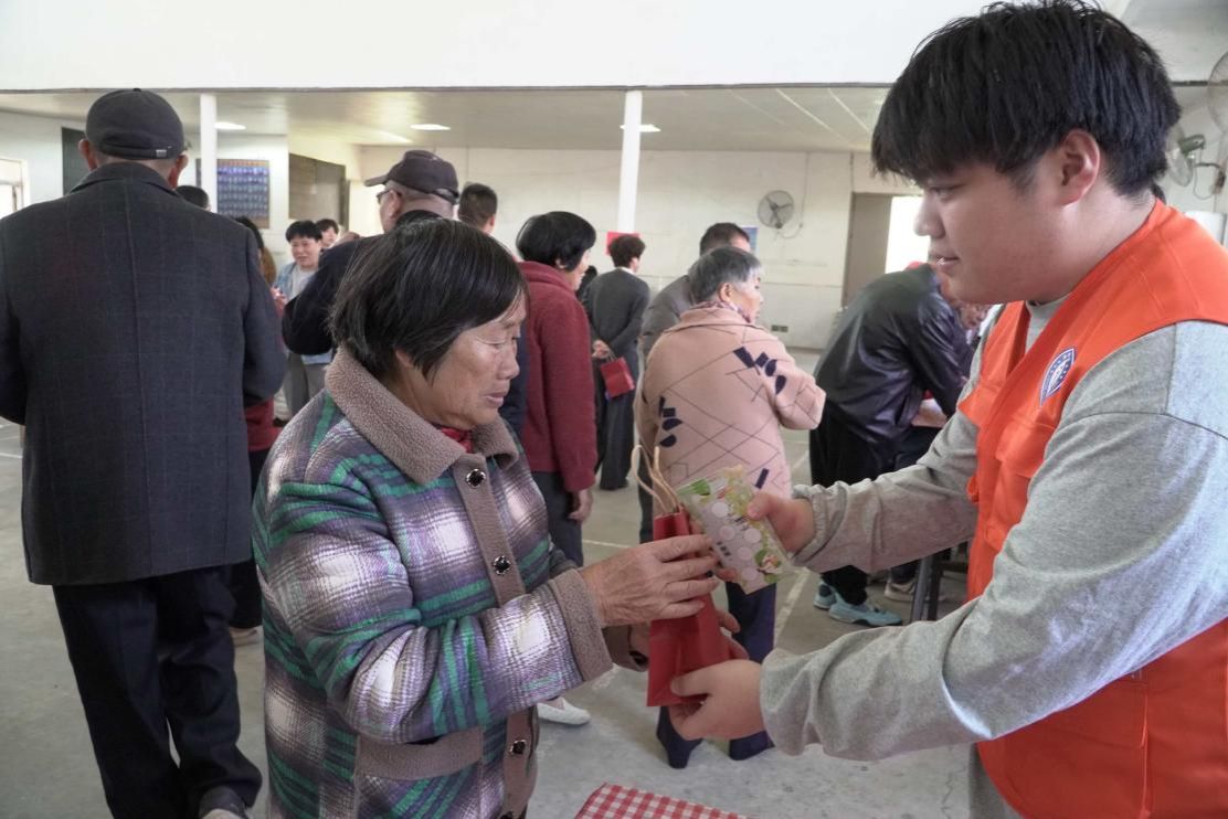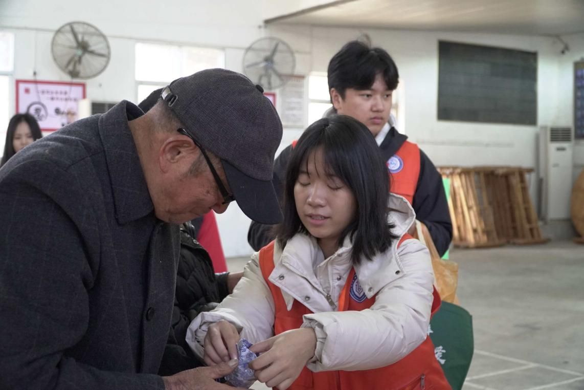 便民服务摊位前暖意融融,学院志愿者全程驻守,成为服务村民的主力军。义剪摊位上,志愿者有序发放、回收义剪卡,引导老人们排队理发,还贴心地为老人围上披肩、清理碎发;义诊摊位前,志愿者协助登记信息、维持秩序,搀扶行动不便的老人完成血压、血糖检测;泰隆银行工作人员开展老花镜配置服务时,志愿者主动帮忙调试度数,还为当天生日的村民送上大米与手写祝福卡片,让特殊日子更添温馨。