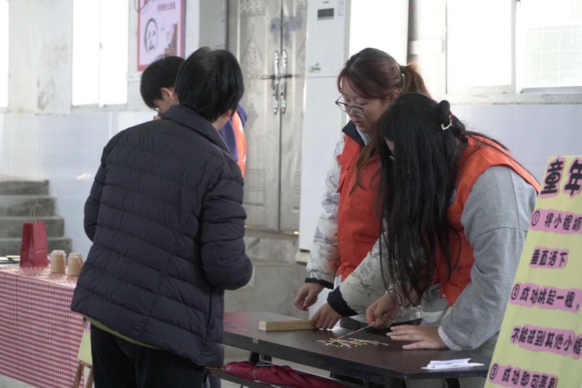 民俗体验与趣味游戏区热闹非凡,学院志愿者化身“文化传播员”,带动村民沉浸式感受传统节日魅力。香囊制作摊位上,志愿者们提前查阅养生知识,手把手教村民搭配中药材、缝制香囊,讲解每种药材的养生功效,一个个香气四溢的香囊承载着健康祈福;嗅觉着健康祈福;“嗅觉大师”游戏中,志愿者提前准备好肉桂、八角、生姜等养生香料,引导老人们细细甄别、踊跃猜答,现场欢声笑语不断;“童年挑棍”游戏区里,志愿者与村民同台竞技,唤起大家的童年记忆,成功时的欢呼声响彻现场。宣传区里,志愿者们配合村委工作人员,用生动的案例向村民普及平安三率、电信防诈及民政政策,让实用知识深入人心。