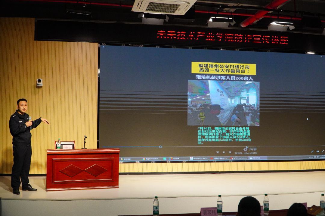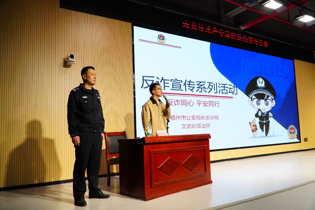 为进一步提升全院师生的反诈骗意识和防范能力,有效遏制电信网络诈骗案件在校园的高发态势,切实保护师生的财产安全与合法权益,营造安全、和谐、清朗的校园环境,学院特联合福州市长乐区公安局文武砂派出所举办本次反诈骗专题宣讲活动。文武砂派出所副所长蒋桂文,我院党总支副书记柯林逸炜,学生工作部(处)学生管理中心主任卓兴涛,学生工作部(处)综合事务科科长易星辰,辅导员黄丽伟、严钰、黄钰沁、唐烨、陈欣悦、黄为欣,以及各年级各专业学生代表到场参会。