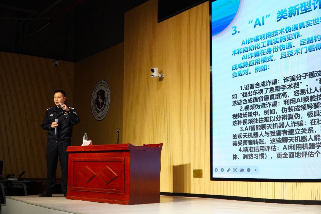 讲座伊始,主讲人蒋桂文警官先明确了电信网络诈骗的定义——不法分子以非法占有为目的,通过远程、非接触式手段编造虚假信息实施诈骗,并介绍了2022年12月1日正式施行的《中华人民共和国反电信网络诈骗法》,以及2025年至今长乐区四百多起电信诈骗案发情况,让师生直观感受到反诈的紧迫性。随后,蒋桂文警官围绕刷单返利、网络交友、网络购物、投资理财、校园贷款、游戏交易、机票退改签7类校园高发骗局展开详细拆解,结合2024年长乐区大学生刷单被骗1.7万元、虚假投资被骗11万余元、网络购物被骗7500元等真实案例,还原了“前期引流-小利诱惑-大额诈骗”的套路流程,还重点讲解了AI合成音视频、智能聊天机器人等新型诈骗的识别方法,期间穿插播放《刷单被骗 现身说法》《以案说诈》等警示视频,强化宣讲效果。
