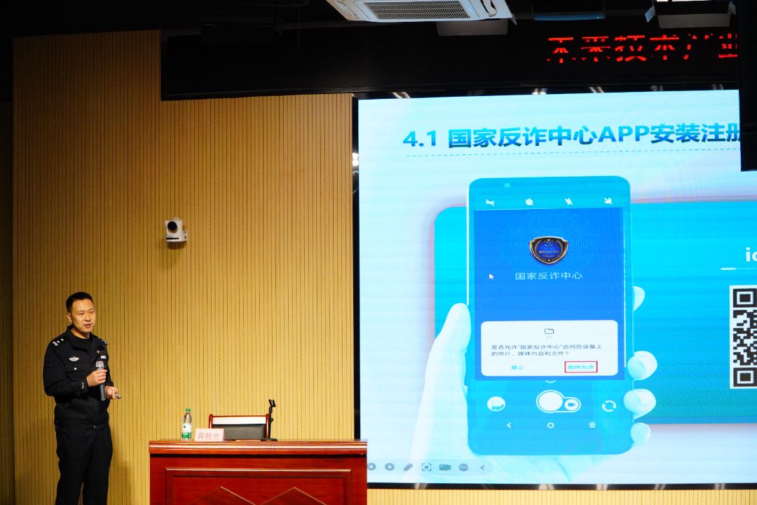 在“不做电诈工具人”板块,蒋桂文警官通过周某某出租银行卡获利5000元却获刑11个月、大学生余某晶帮拨诈骗电话赚300元被刑拘等案例,清晰界定了供卡、手机口、引流三类“工具人”的行为模式,明确告知大家此类行为可能构成帮信罪、掩饰隐瞒犯罪所得罪等,需承担相应法律责任。蒋桂文警官还现场演示了国家反诈中心APP的iOS和Android系统下载注册步骤,指导师生开启相关权限,并呼吁大家关注国家反诈中心微信视频号、抖音等官方政务号,牢记“个人信息不透露、陌生链接不点击、陌生好友不轻信、转账汇款多核实”的“三不一多”原则,还通过互动问答解答了师生关于骗局识别、应急处置的疑问。