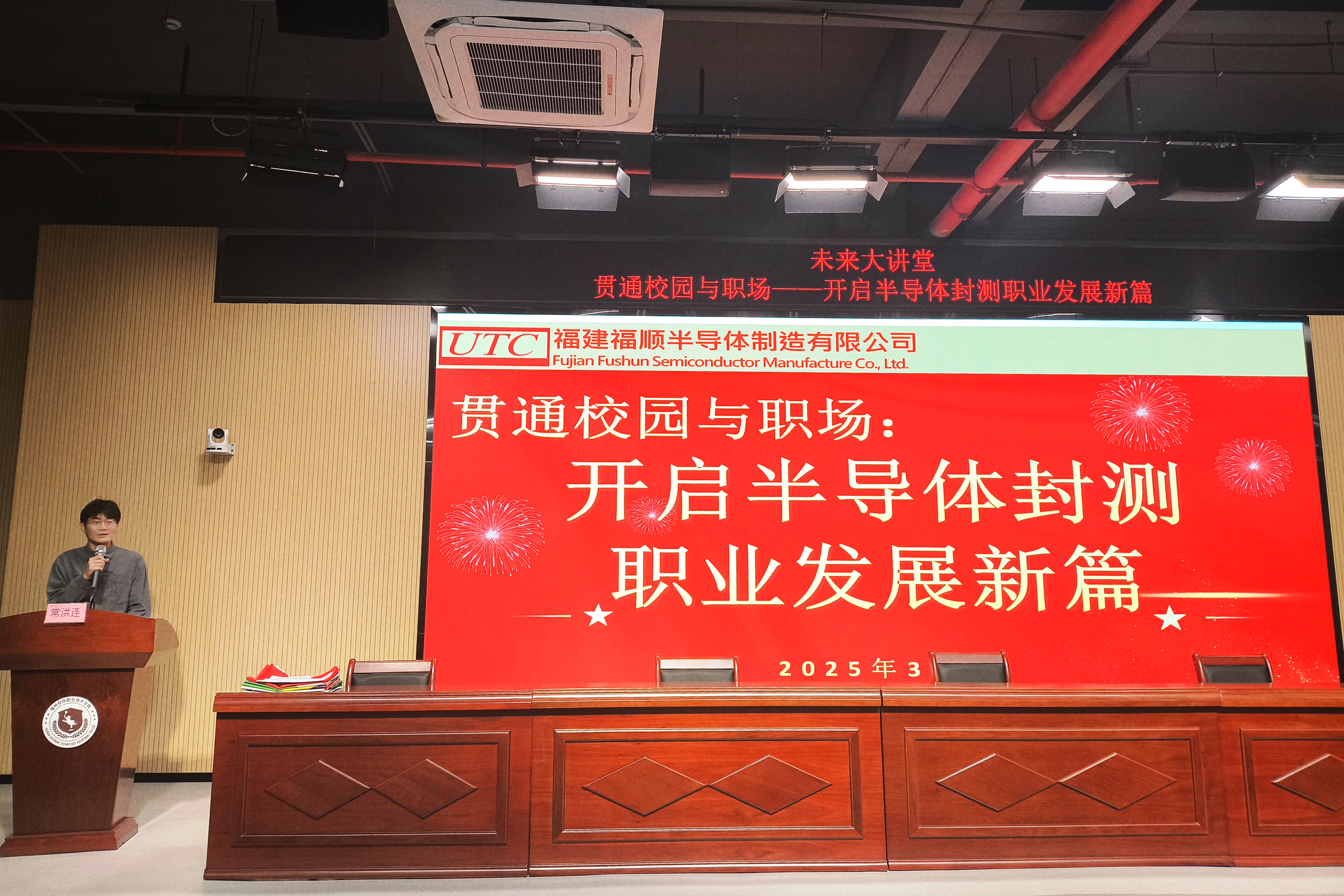 在推动教育与产业深度融合的进程中,为助力在校学生全方位、深层次地洞察半导体行业,扎实搭建起校园与职场之间的稳固桥梁,未来技术产业学院携手福顺半导体制造有限公司(以下简称 “福顺半导体”),于 2025 年 3 月 13 日下午 13:30,成功举办了一场主题为 “贯通校园与职场,开启半导体封测职业发展新篇” 的讲座及宣讲会。本次活动由福顺半导体姚建铸课长、姚小芳经理及人事专员常洪连共同主讲,吸引了近百名师生积极参与。