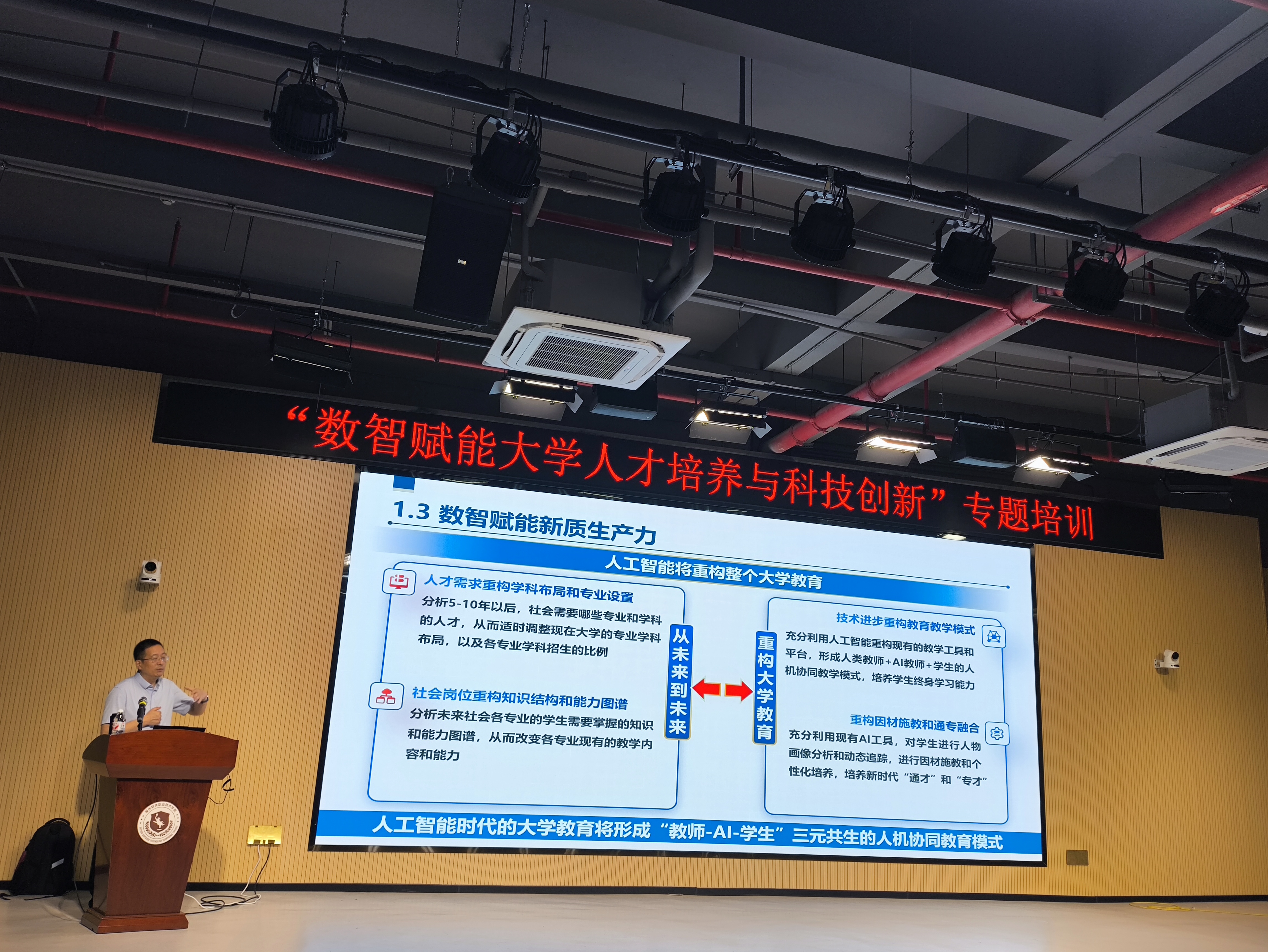 2025年5月22日,由我校主办的“数智赋能人才培养专项培训”在未来技术产业学院产教融合基地L311报告厅顺利举行。本次培训特邀天津大学教务处副处长、博士生导师王建荣教授作主题报告,围绕人工智能国家战略、大模型发展及教育变革等热点话题展开深入探讨,吸引了各学院教师代表积极参与。