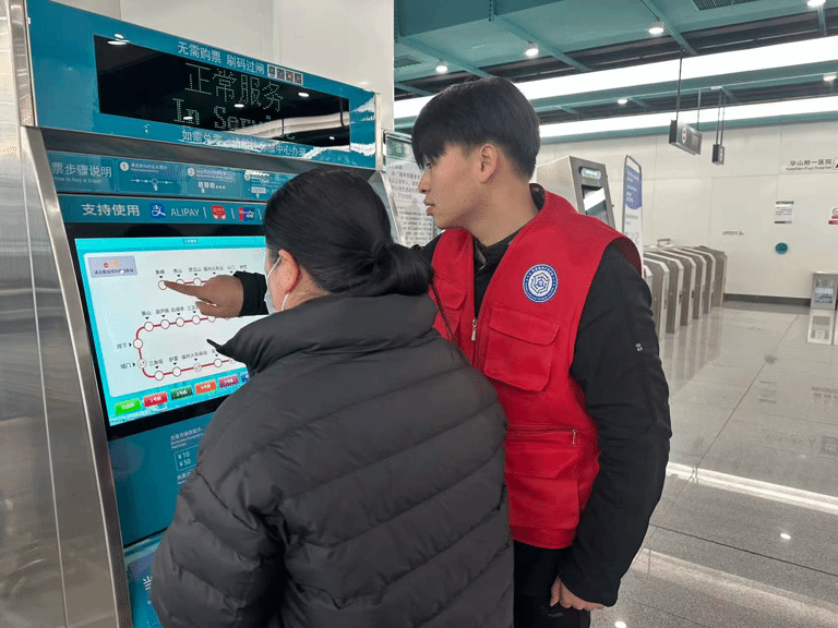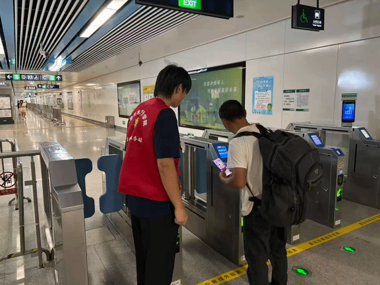 地铁站内,志愿者的身影遍布各个角落:在出入口与换乘通道引导乘客有序通行,有效疏解客流压力;在自动售票机旁耐心协助老年人、残障人士及有需要乘客购票,蹲身沟通、细致演示操作流程,在闸机口快速响应票务疑问,及时化解难题,显著提升服务效率与质量。