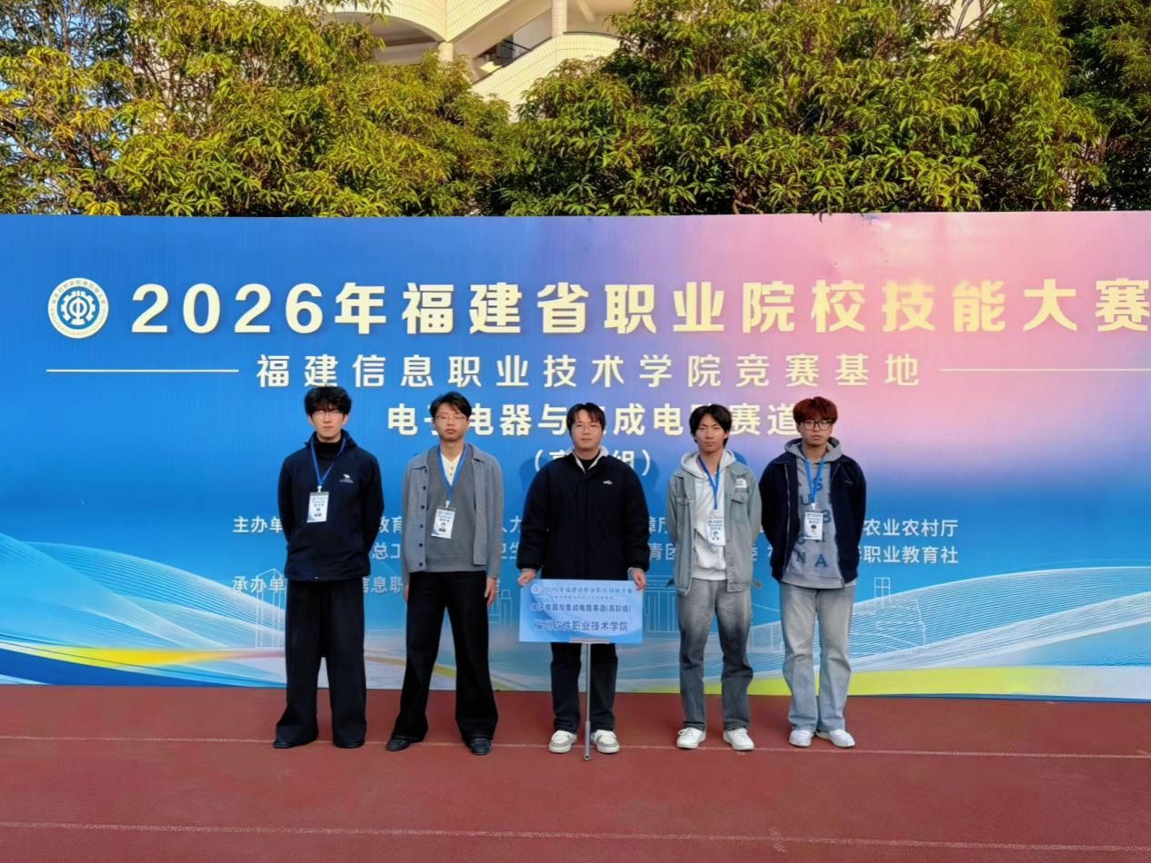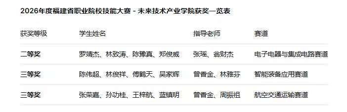 2026年1月10日-1月12日,在2026年度福建省职业院校技能大赛中,我校未来技术产业学院学子凭借扎实的专业功底与出色的实践能力,分别在电子电器与集成电路赛道斩获银奖(二等奖)1项,智能装备应用赛道斩获铜奖(三等奖)1项、航空交通运输赛道斩获铜奖(三等奖)1项。