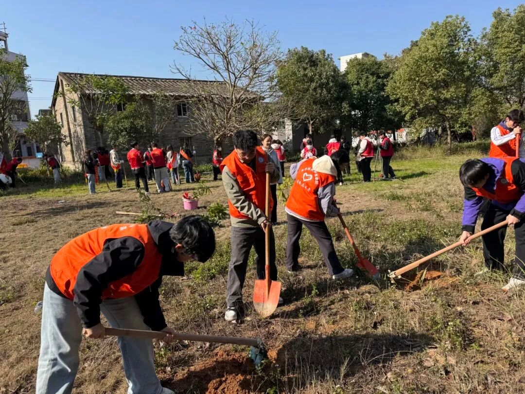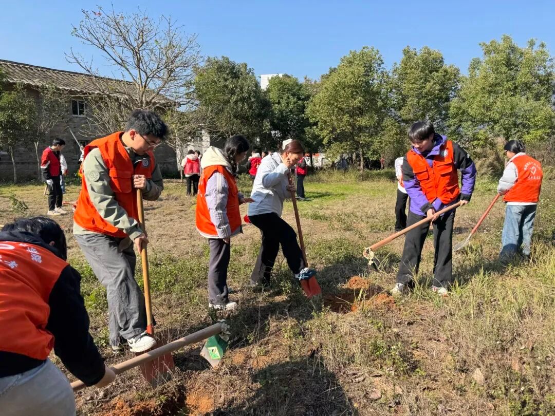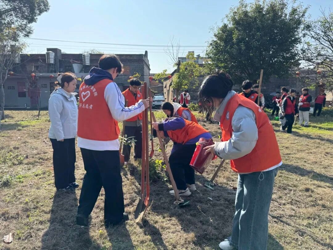 活动现场,我院师生与镇村干部、企业代表等志愿者共计80余人齐聚一堂,大家身着统一的橙色志愿马甲,手持铁锹、锄头、水桶等工具,在各联合单位专业人员的指导下分工协作、默契配合。大家挥锹挖坑、扶苗培土、提桶浇水,每一道工序都严谨细致、一丝不苟。从三五人一组合力栽种闽楠、金桔等苗木,到单人俯身细致夯实土层、清理杂草,阳光下的身影干劲十足,现场一派热火朝天的劳动景象,春日的田野间处处洋溢着青春活力与劳动热情。