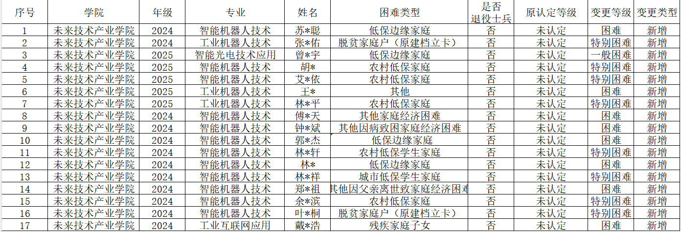 未来技术产业学院开展2026年春季家庭经济困难学生认定微调工作,经过学生个人申请、班级民主评议、辅导员及院系意见审核,现将初审名单进行公示(公示期:2026年4月16日-4月20日)。在此期间欢迎广大师生以来信(3837718872@qq.com)来访或来电(13626065753)的形式向未来技术产业学院学生资助工作认定小组反映情况,发表看法和意见。