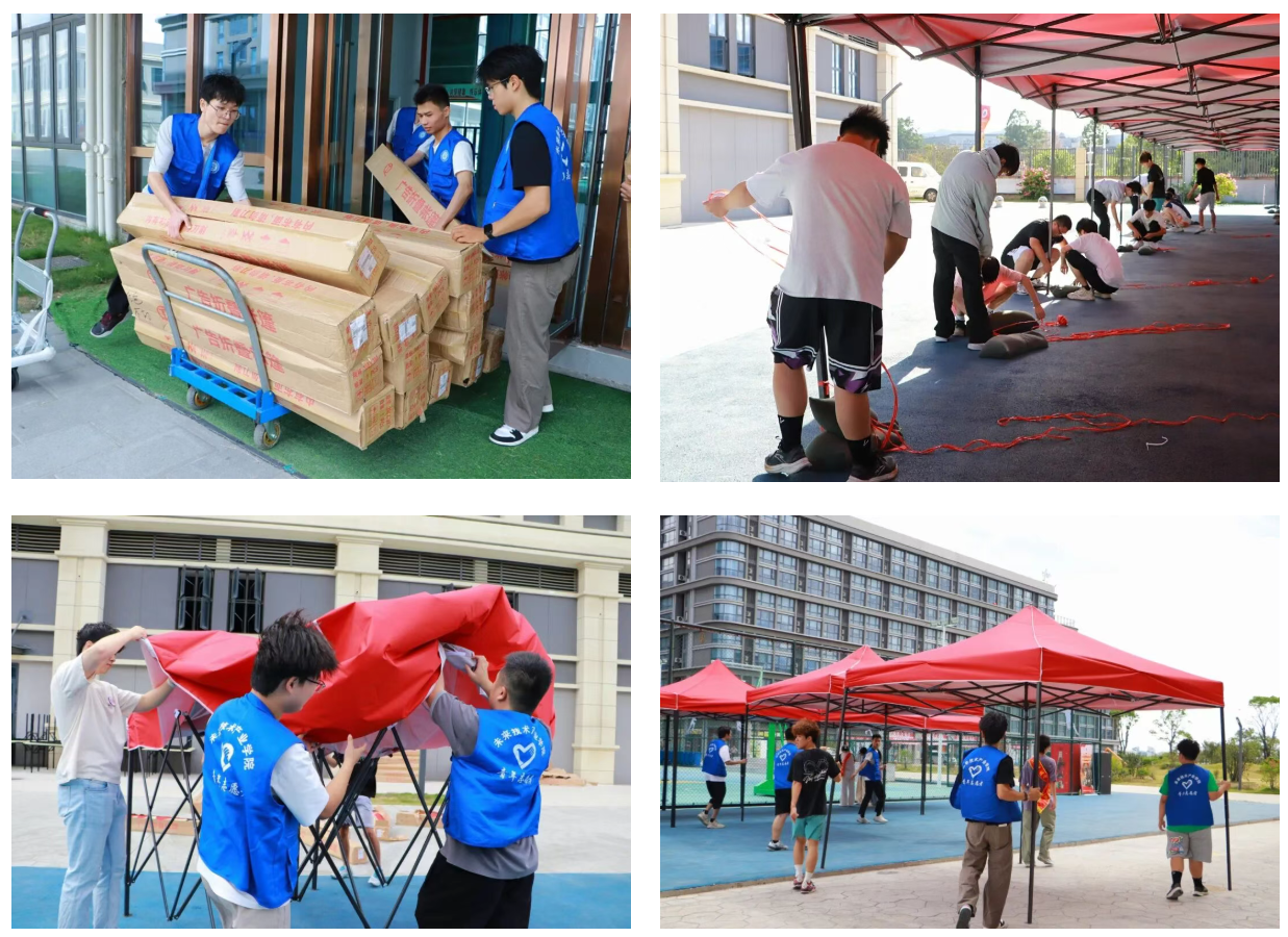 与此同时,一群可爱的身影正在校园里忙碌着——他们就是2025级新生志愿者们!他们提前搬运桌椅、帐篷支架、饮用水等迎新物资,在指定区域有序搭建迎新帐篷,红色帐篷整齐排列;他们在老师的带领下排练迎新流程,模拟新生报到可能遇到的各类场景,优化引导话术;学院领导也特地来到迎新现场,查看准备工作进展情况,对志愿者们的辛勤付出给予了充分肯定。所有人用汗水浇筑欢迎的仪式感,只为让你们踏入校门的第一刻,就感受到家的温暖。