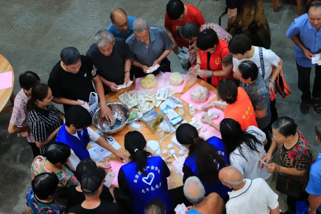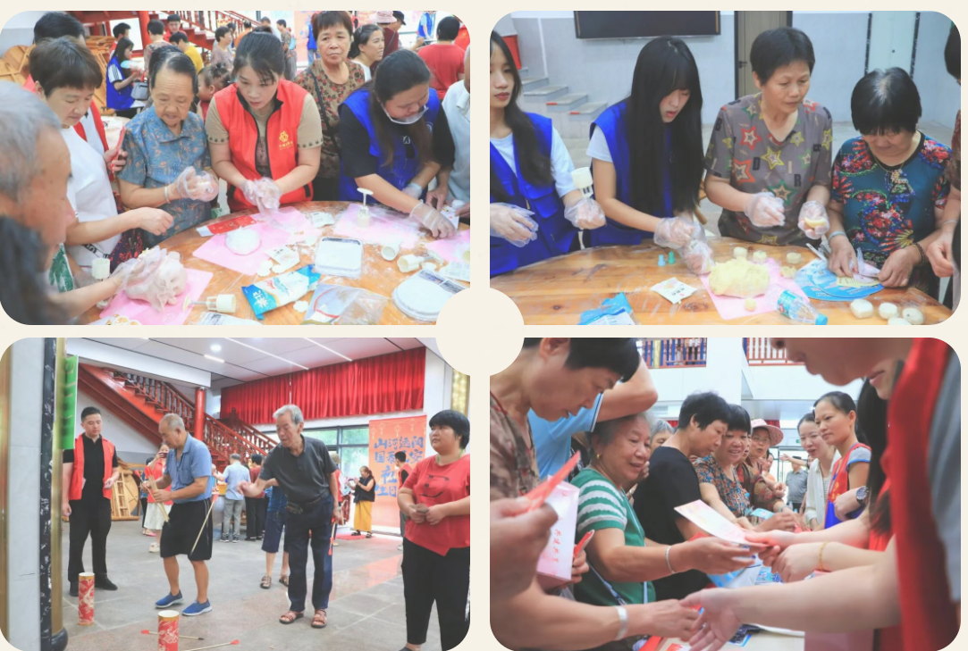 活动现场更是热闹得像裹了层糖霜,满耳都是此起彼伏的欢声笑语,连空气里都飘着欢喜的味道。老人们在各个游戏区里玩得不亦乐乎,处处是鲜活的热闹景象:投壶区前,几位老人挺直腰板,一手背在身后,一手捏着箭矢瞄准壶口,眼神专注得像在摆弄心爱之物,箭支入壶时,周围立刻响起阵阵喝彩,没投中也不气馁,笑着摆摆手再来一次;旁边的 “海底捞月”桌前,老人们握着长柄夹子,小心翼翼地在装满清水的碗里夹起圆润的弹珠,有的手稳得很,一颗接一颗精准放进托盘,有的偶尔失手,弹珠 “扑通” 落回水里,便和邻座相视一笑,互相支招 “慢点儿夹,别慌”;有几位围在冰皮月饼制作桌前,戴着手套慢慢揉着粉白的面团,虽然动作稍缓,却格外认真,把豆沙馅仔细裹进冰皮里,再用模具一压,看着印着花纹的月饼成型,眼里满是成就感,偶尔还互相调侃 “你这月饼馅儿包得足,吃着肯定甜”,热闹的声响裹着冰皮的清甜,把中秋的暖意烘得格外浓。志愿者们在旁耐心指导,时而帮忙揉面,时而分享造型技巧,手手相传间,不仅传递了手工技艺,更传递了跨越年龄的温情。