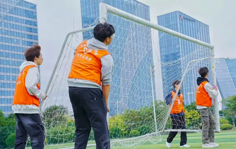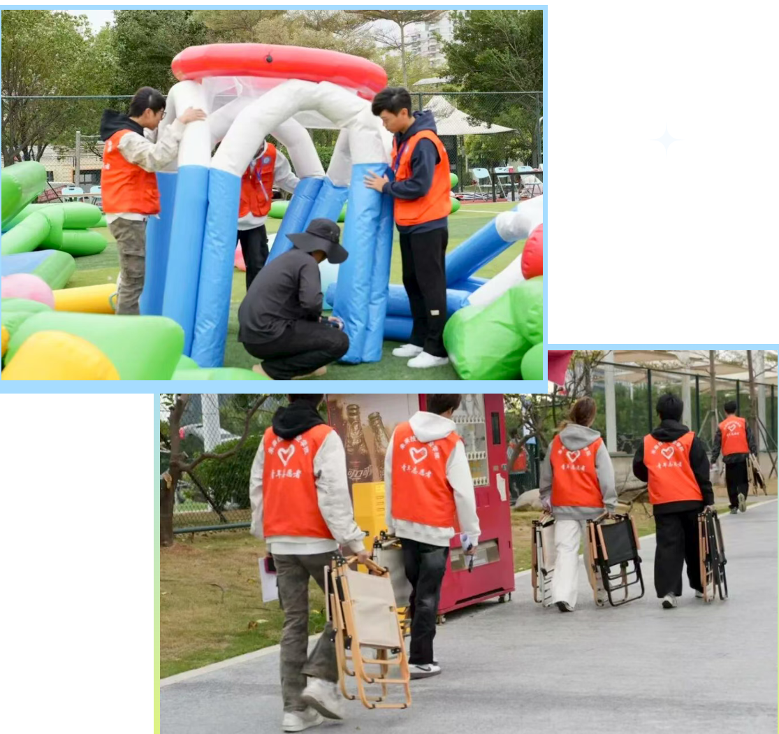 清晨七点,我院志愿者们已精神抖擞地抵达活动现场,迅速投入到紧张的赛前准备工作中。在运动场上,志愿者们分工明确、协作有序:有的团队合力搬运、搭建足球门,为后续赛事场地布置筑牢基础;有的仔细检查、调整趣味运动的充气道具,确保每一处设施安全可靠;还有的穿梭在场地间,搬运、摆放座椅,为参赛职工和观众营造舒适的活动环境。
