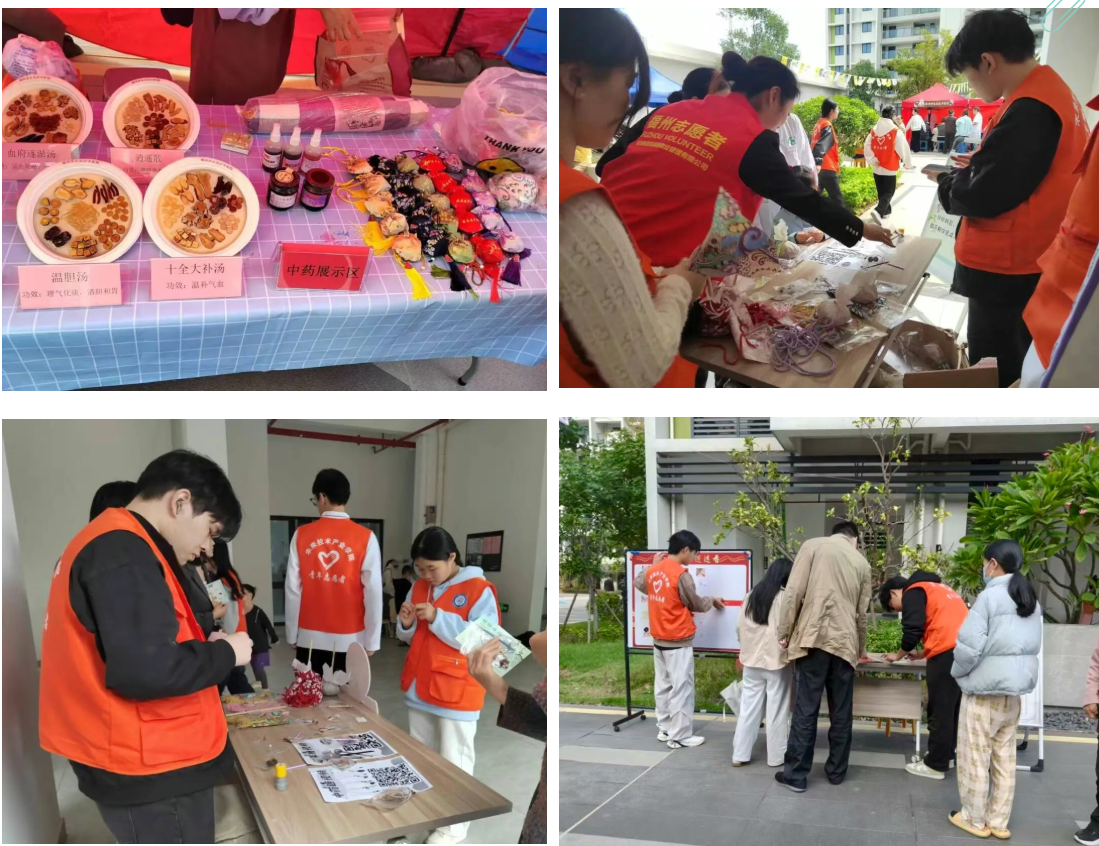 活动进行时,志愿者们各守其位、各尽其责,成为现场一道亮眼的青春风景线。签到区的同学高效完成参与人员登记,有序发放游园券与养生穴位卡片;游戏挑战区里,大家耐心讲解“百草夹夹乐”“emoji猜中药”“穴位探险家”的规则,引导参与者在趣味互动中感受中药魅力与中医智慧;中医体验区的志愿者协助专业医师开展把脉问诊、针灸、拔罐等服务,细致做好火罐消毒、人员引导等辅助工作;手工与美食区的同学们认真核对游园券印章,发放手工材料包与糖画,手把手指导参与者制作艾草捶、中药挂链,让大家在动手实践中收获满满。全程中,志愿者们以热情友善的态度接待每一位社区居民与两岸同胞,主动解答疑问、提供帮助,充分展现了福软学子的责任与担当。
