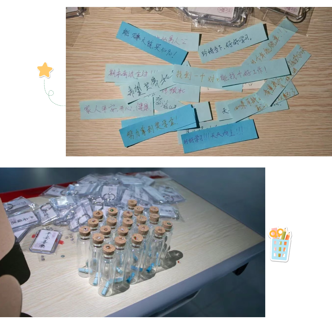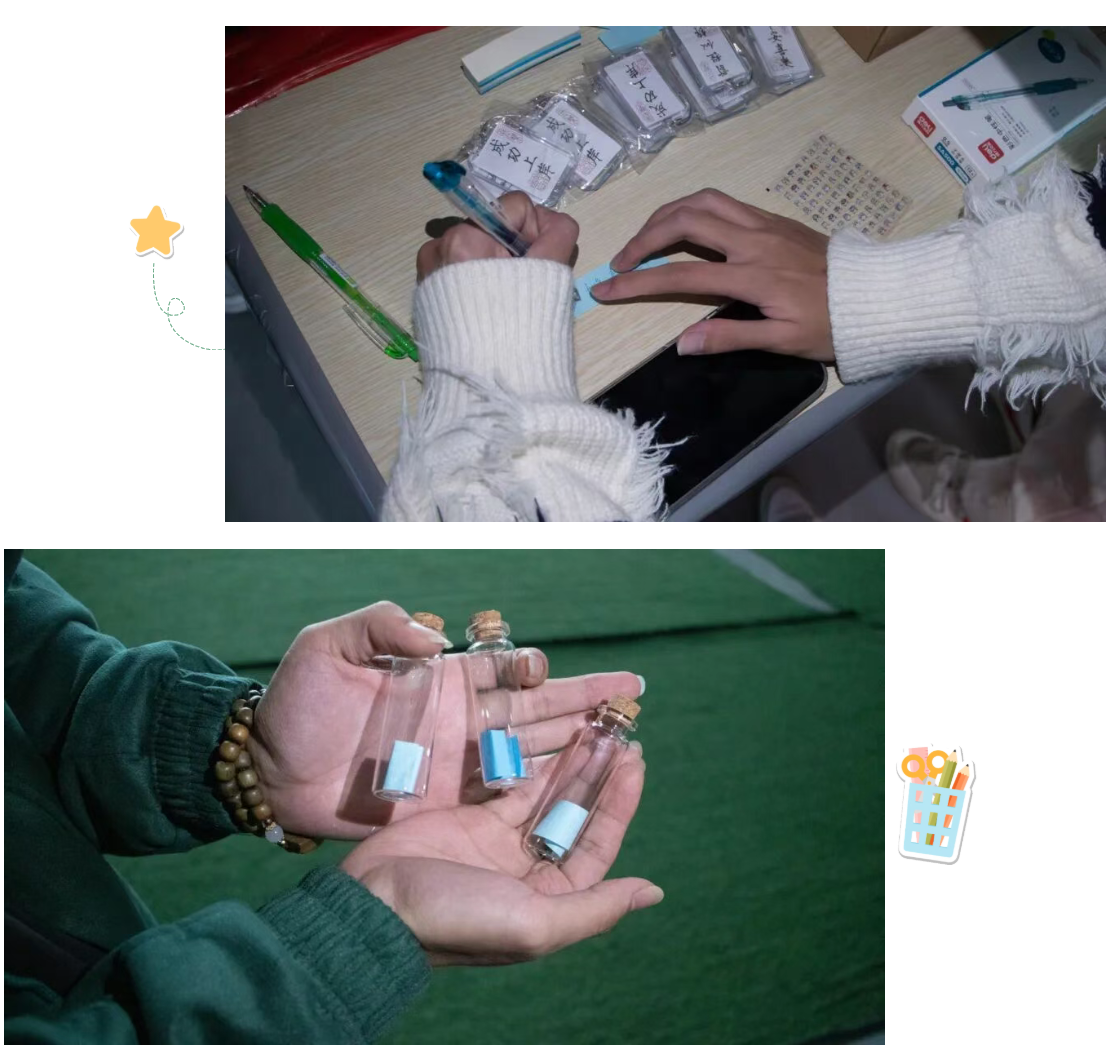 活动现场布置得治愈又雅致,桌面被一排排透亮的小玻璃瓶整齐铺满,阳光透过圆润的瓶身,在桌面洒下细碎又温暖的光斑,远远望去格外吸睛。桌面两侧的盒子里,各色小纸条叠得规整,分别适配软萌心愿、考试冲劲、职业期盼、未来计划等不同诉求,旁边还摆放着琳琅满目的DIY装饰贴纸和色彩鲜亮的彩笔,供大家根据心意风格自由搭配创作。工作人员早已分工明确,有的耐心引导参与者挑选物料,有的协助记录温馨瞬间,有的维护现场秩序,全程井然有序。